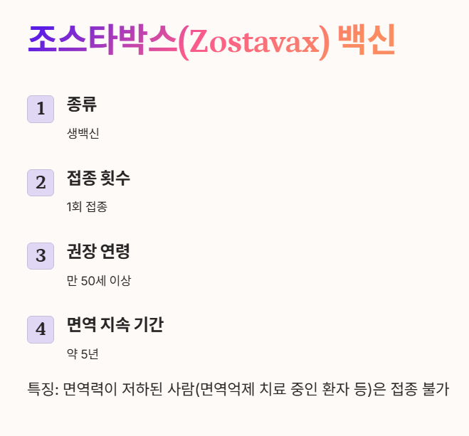 👉 조스타박스(생백신)는 임산부에게 권장되지 않으며, 싱그릭스도 안전성이 확립되지 않아 임신 중 접종은 피하는 것이 좋습니다.