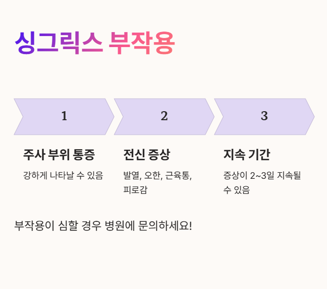 👉 주사 부위 통증, 발열, 근육통 등이 나타날 수 있지만 대부분 경미하며 2~3일 내 사라집니다. 다만, 심한 알레르기 반응(두드러기, 호흡곤란 등)이 있으면 즉시 병원을 방문하세요.