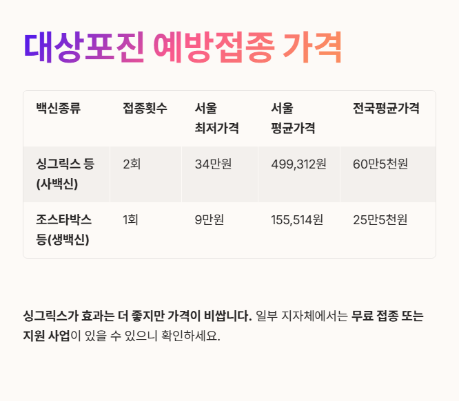 👉 싱그릭스(2회 접종)는 효과가 더 오래 지속되고 면역저하자도 맞을 수 있어 추천됩니다. 하지만 조스타박스(1회 접종)는 가격이 저렴하고 접종이 간편한 장점이 있습니다.