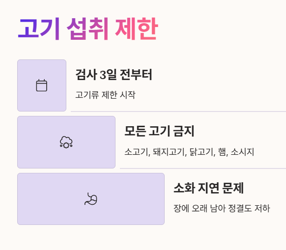 • 오전 검사일 경우: 전날 정오 이후는 고형 음식 금지, 저녁 7~8시까지는 맑은 유동식 섭취만 허용