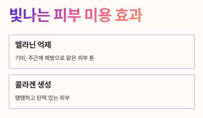- 또한, 콜라겐 생성을 도와 피부를 탱탱하고 탄력 있게 가꿔줘요.