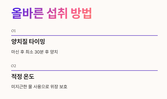 - 특히 치아가 약하거나 위장 질환이 있다면 매일 마시는 것보다 2~3일에 한 번씩 마시는 등 횟수를 조절하고, 몸의 반응을 살피면서 드시는 것이 안전합니다.