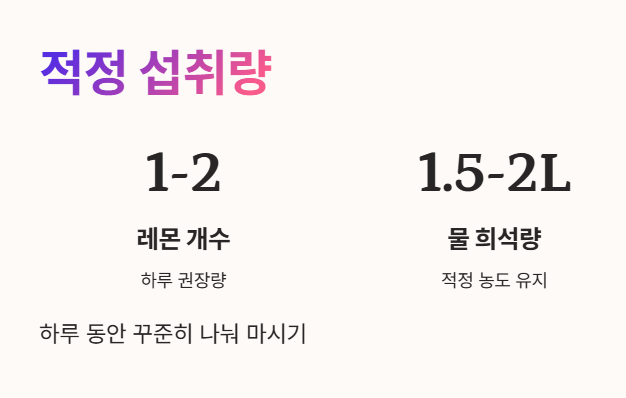 - 하루에 레몬 1~2개 분량을 물 1.5~2L에 희석해서 나눠 마시는 것이 적당합니다.