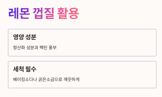 - 다만, 수입 레몬은 농약이나 왁스 처리가 되어 있을 수 있으니, 베이킹소다나 굵은소금으로 깨끗하게 세척한 후 사용하세요.