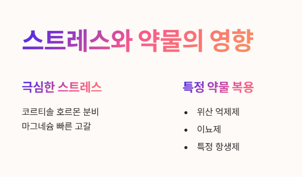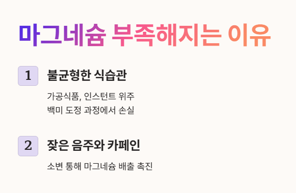 위산 억제제나 이뇨제, 특정 항생제 등을 장기간 복용할 경우, 마그네슘의 흡수를 방해하거나 배출을 증가시켜 결핍을 유발할 수 있습니다.