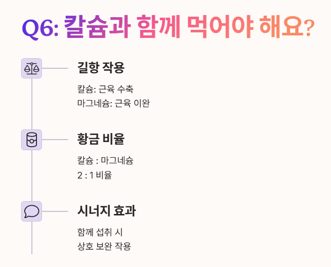 Q6: 마그네슘, 칼슘이랑 같이 먹어야 효과가 좋다고 하던데요?