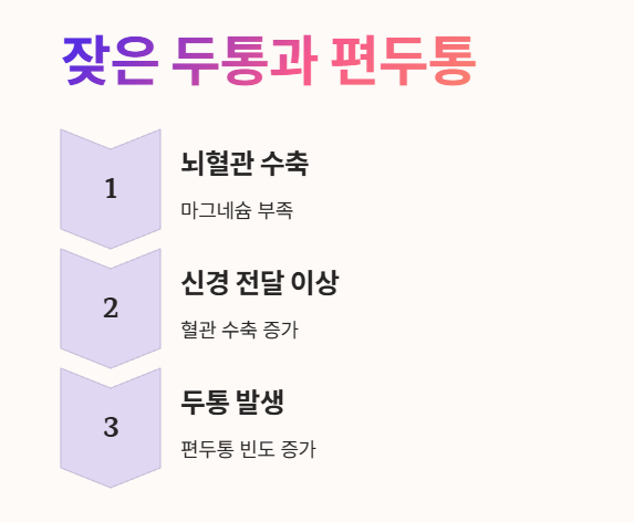 체내 마그네슘 수치가 낮아지면 혈관이 수축하고 신경 전달 물질에 이상이 생겨 두통이나 편두통이 더 자주 발생할 수 있습니다. 🤕