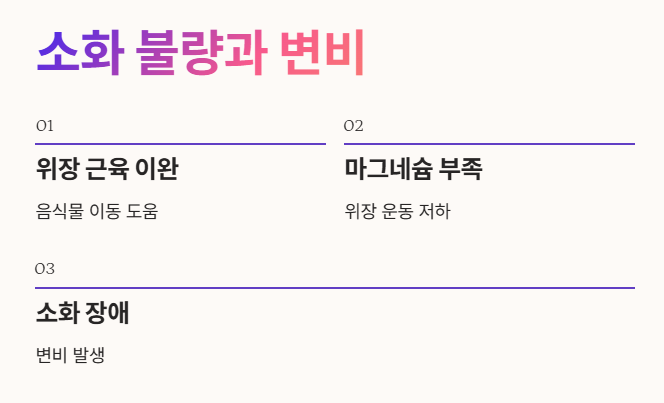 부족해지면 위장 운동이 느려져 소화가 잘 안되고, 변비가 생기기도 한답니다. 😓
