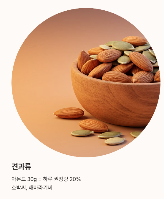 아몬드 한 줌(약 30g)에는 마그네슘 하루 권장량의 약 20%가 들어있어요.