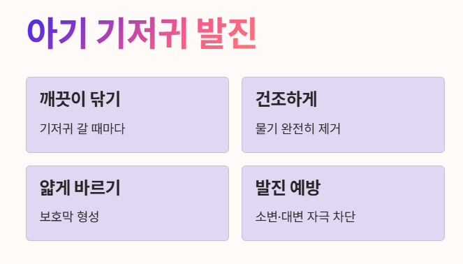 - 기저귀를 갈 때마다 엉덩이를 깨끗하게 닦고 건조한 뒤 얇게 펴 발라주면 기저귀 발진 예방과 완화에 도움이 됩니다.