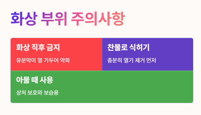 - 반드시 찬물로 충분히 열기를 식힌 후, 상처가 아물기 시작할 때쯤 피부 보호와 보습을 위해 사용하는 것이 좋습니다.