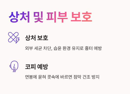 - 가벼운 상처나 긁힌 곳에 바르면 상처 부위를 외부 세균으로부터 보호하고, 습윤 환경을 유지해 흉터가 생기는 것을 줄여줘요.