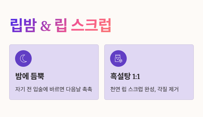 - 바세린과 흑설탕을 1:1 비율로 섞으면 자극 없는 천연 립 스크럽이 완성! 입술 각질을 부드럽게 제거해 준답니다.