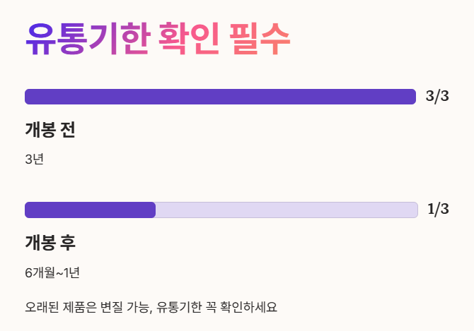- 보통 개봉 전에는 3년, 개봉 후에는 6개월에서 1년 이내에 사용하는 것을 권장해요.