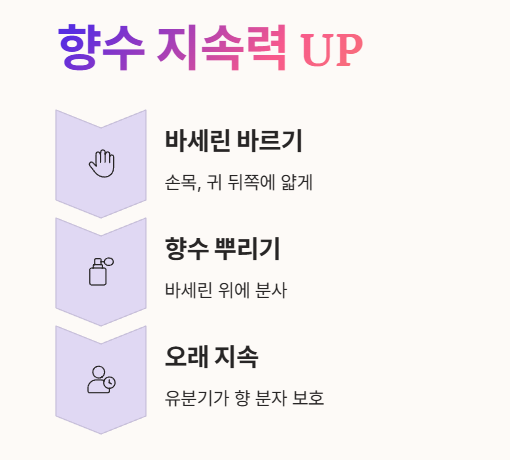 - 향수를 뿌리기 전 손목이나 귀 뒤쪽에 바세린을 살짝 바르고 그 위에 향수를 뿌려보세요.