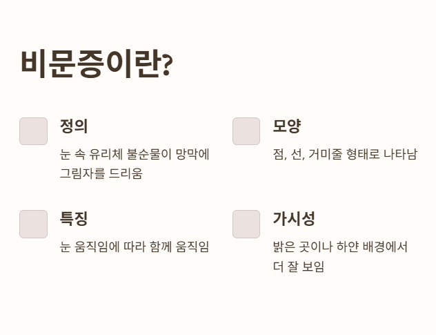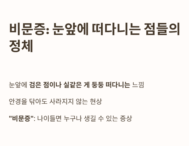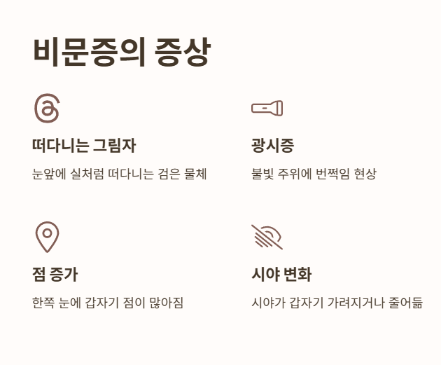 저도 처음엔 그냥 피로한가 싶었는데, 비문증은 방치하면 더 큰 질환으로 이어질 수 있더라고요.