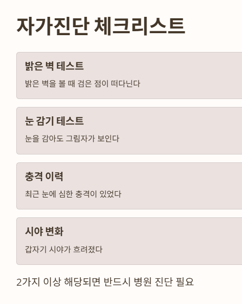 - 망막박리/망막열공: 매우 위험, 조기 진단 필수