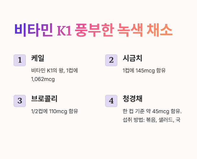 비타민 K는 혈액 응고와 뼈 건강, 심혈관 보호에 꼭 필요한 영양소입니다. 특히 비타민 K1은 녹색 잎채소에, 비타민 K2는 발효 식품과 동물성 식품에 풍부하게 들어 있어 식단을 통해 충분히 섭취할 수 있습니다.