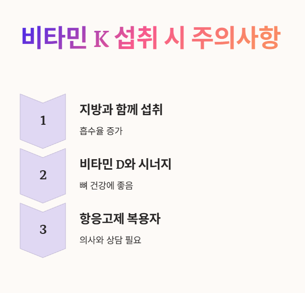 - 와파린 등 항응고제 복용자는 비타민 K 섭취 시 의사와 상담 필요.