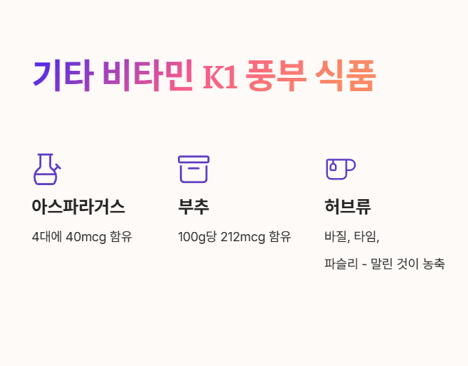 - 비타민 K2 (메나퀴논): 발효 식품과 동물성 식품에 풍부하며, 뼈 건강과 심혈관 보호에 더 큰 영향을 미칩니다.