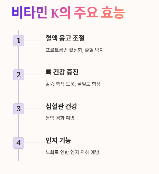 - 비타민 K2는 동맥벽에 칼슘이 쌓이는 것을 방지하여 동맥 경화 예방.