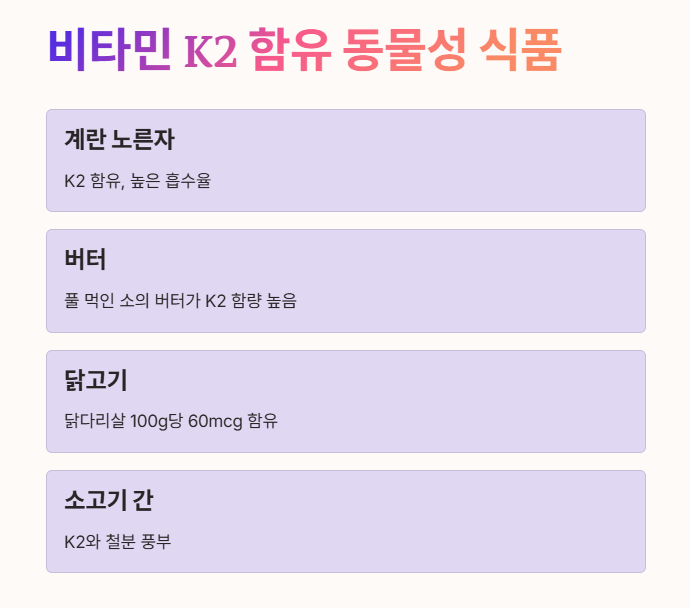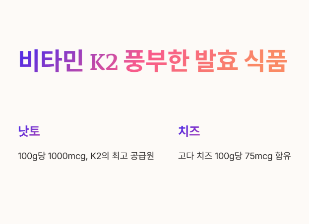 - 비타민 K2 (메나퀴논): 발효 식품과 동물성 식품에 풍부하며, 뼈 건강과 심혈관 보호에 더 큰 영향을 미칩니다.