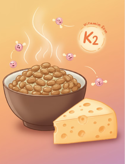 - 비타민 K2는 오스테오칼신 단백질을 활성화하여 칼슘이 뼈에 축적되도록 돕습니다.