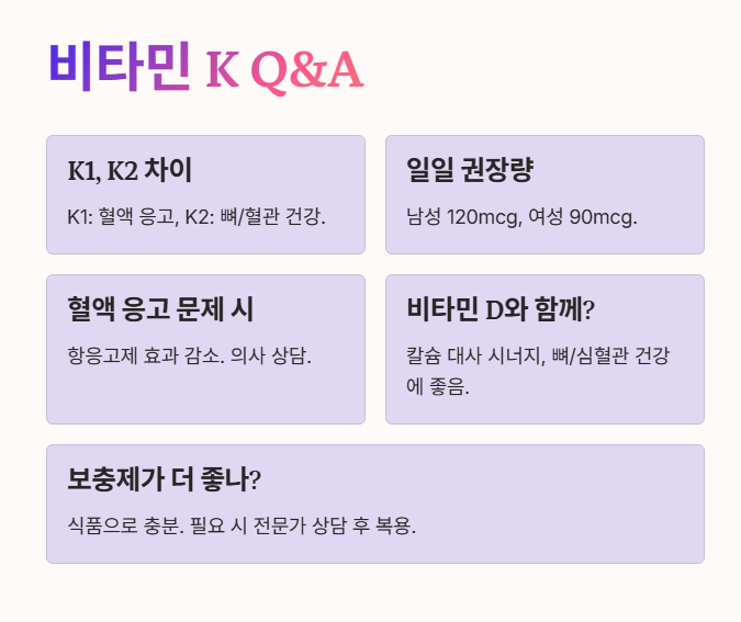 - 와파린 등 항응고제 복용자는 비타민 K 섭취 시 의사와 상담 필요.