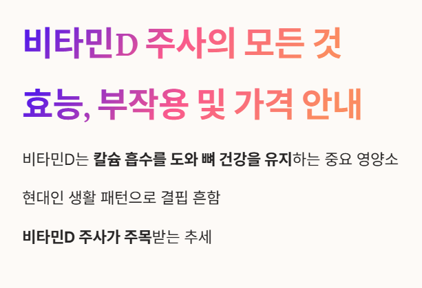 이번 글에서는 비타민D 주사의 가격, 효능, 부작용 등에 대해 상세히 알아보겠습니다.