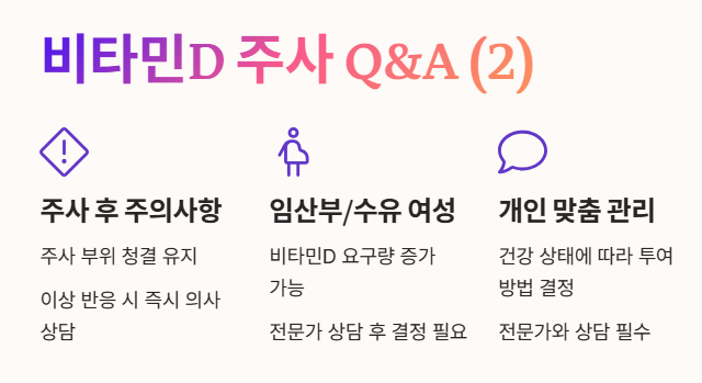 A4: 주사 후에는 주사 부위를 청결하게 유지하고, 이상 반응이 나타나면 즉시 의료진과 상담해야 합니다. 또한, 과도한 비타민D 섭취를 피하기 위해 다른 보충제나 식이 요법과의 중복을 주의해야 합니다.