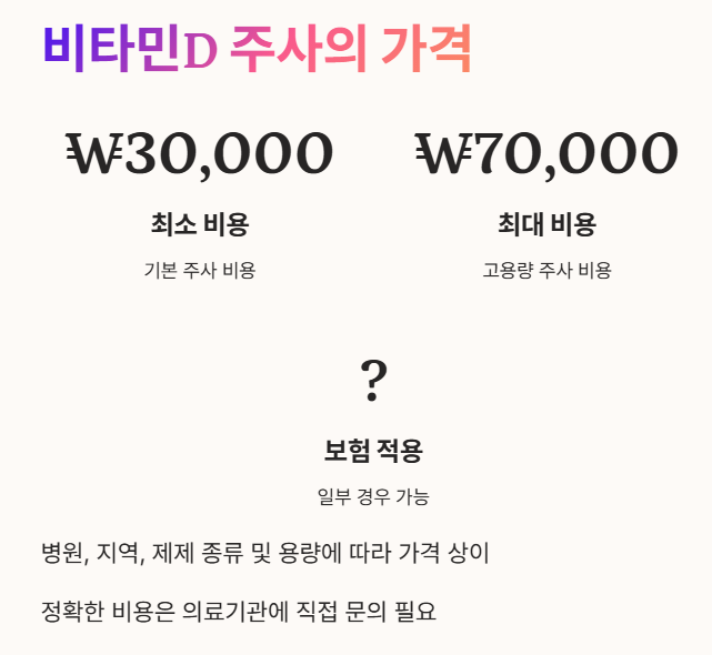 비타민D 주사의 가격은 병원, 지역, 사용되는 제제의 종류 및 용량에 따라 다릅니다.