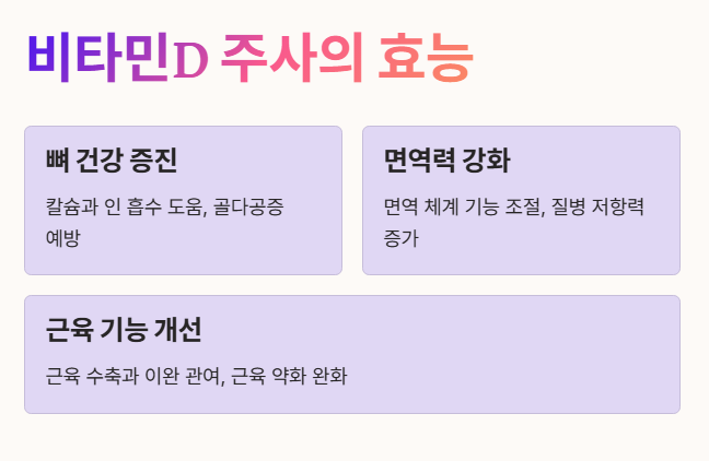 비타민D는 우리 몸에서 칼슘 흡수를 도와 뼈 건강을 유지하는 데 중요한 역할을 합니다. 그러나 현대인의 생활 패턴으로 인해 비타민D 결핍이 흔히 발생하고 있으며, 이를 보충하기 위한 방법 중 하나로 비타민D 주사가 주목받고 있습니다.