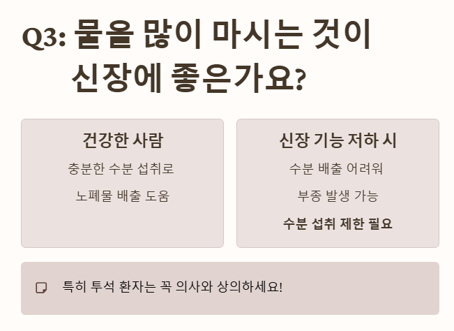 - 하지만 이미 신장 기능이 저하된 경우(특히 투석 환자), 수분 배출이 어려워 부종 등이 생길 수 있으므로 수분 섭취를 제한해야 할 수도 있어요. 꼭 의사와 상의하세요!