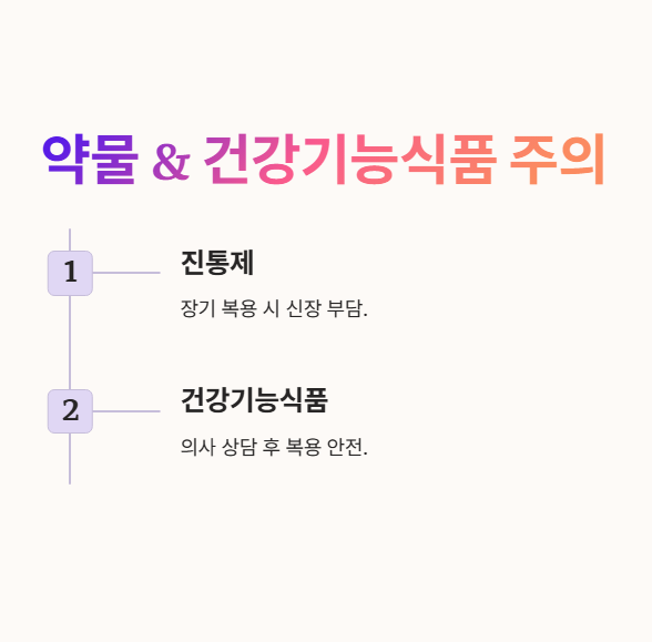 - 진통제(이부프로펜, 나프록센)와 같은 약물을 장기간 복용하면 신장에 부담이 될 수 있음