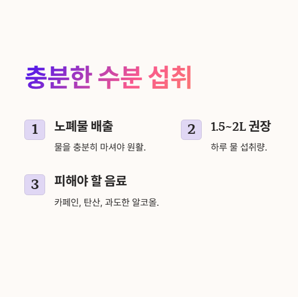 - 신장이 노폐물을 원활하게 배출하려면 물을 충분히 마셔야 함