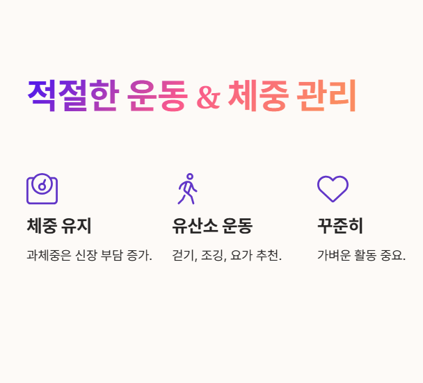 - 과체중은 신장 부담 증가 → 적절한 체중 유지 필수