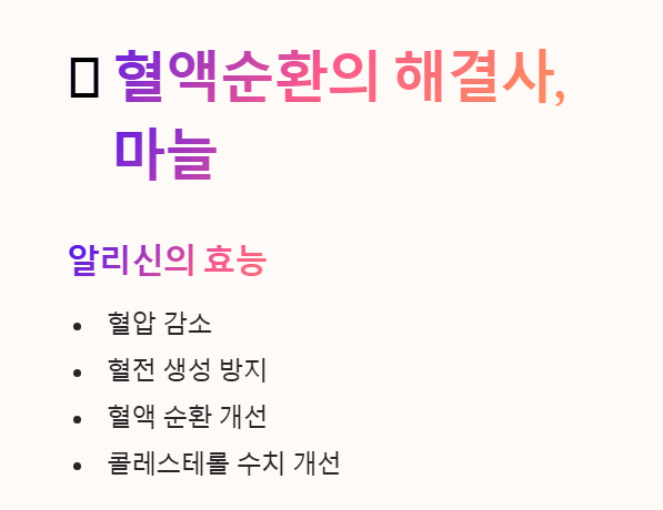 알리신은 혈압을 낮추고 혈전(피떡)이 생기는 것을 막아 혈액이 원활하게 흐르도록 도와준답니다.