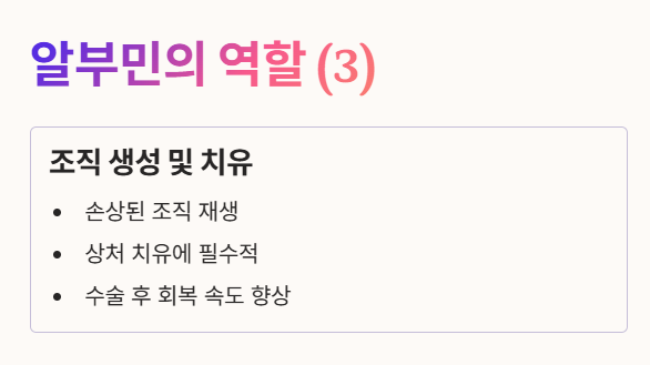 - 수술 후 회복이나 큰 상처가 났을 때 알부민이 충분해야 회복 속도가 빨라진답니다. 🩹