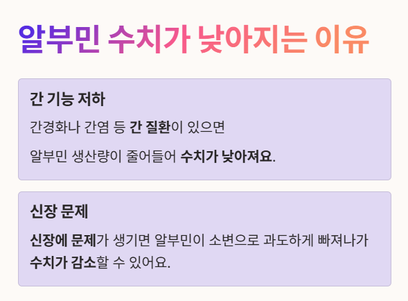 - 신장에 문제가 생기면 알부민이 소변으로 과도하게 빠져나가 수치가 감소할 수 있어요.