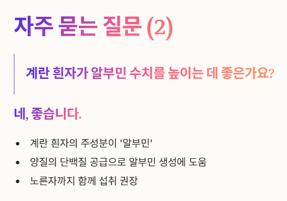 - 계란 흰자의 주성분이 '알부민'이기 때문에 양질의 단백질을 공급하여 알부민 생성에 도움을 줄 수 있습니다.
