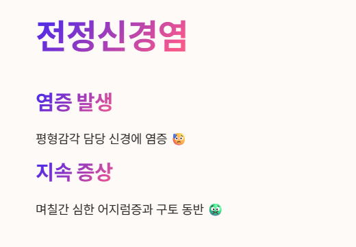 - 특별한 자세 변화 없이도 며칠간 지속되는 심한 어지럼증과 구토를 동반할 수 있어요. 🤢