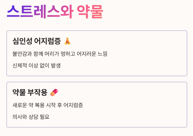 - 일부 고혈압약, 안정제, 항우울제 등은 부작용으로 어지럼증을 유발할 수 있어요. 💊