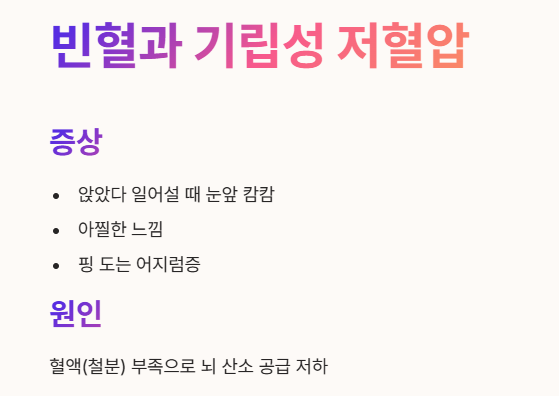 - 주로 일어설 때 '핑' 도는 느낌이나 '아찔한' 느낌(기립성 저혈압)을 받기 쉬워요. 🫠