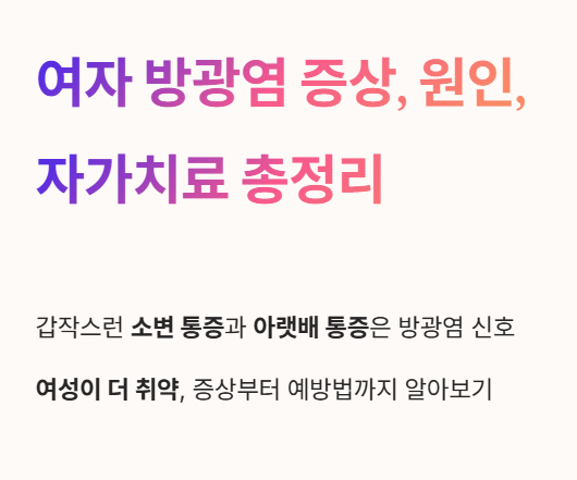 여자 방광염의 증상과 원인, 효과적인 자가치료법과 예방법까지 한 번에 정리했습니다. 방광염으로 고민이라면 지금 바로 확인해 보세요! 😉