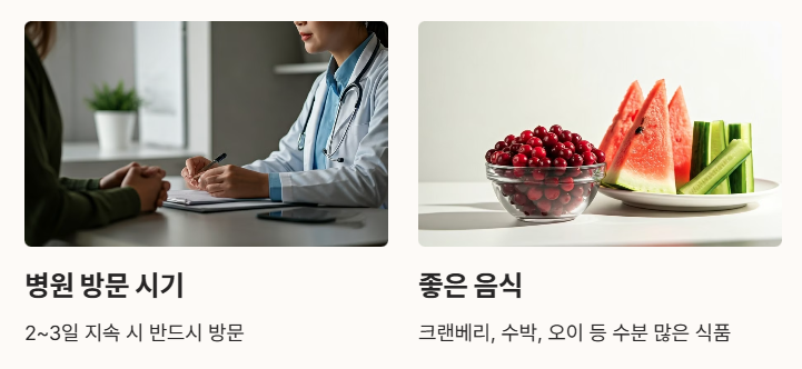 이런 증상은 대부분 1~2일 이내 갑작스럽게 나타나고 악화될 수 있어요. 무시하면 신우신염 같은 상부 요로감염으로 번질 위험도 있으니 주의하세요! 🚨
