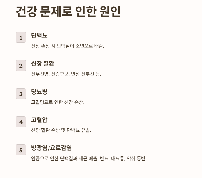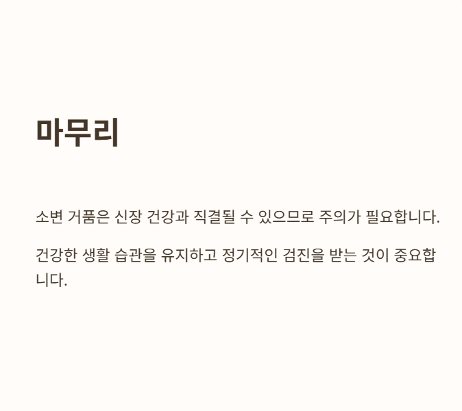 - 특히 거품 소변과 함께 부종, 고혈압, 피로감이 있다면 병원 검진이 필요합니다.