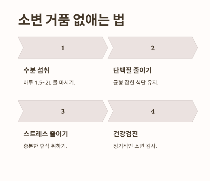 - 하루 1.5~2L 정도의 물을 꾸준히 마시면 소변 농도가 낮아져 거품이 줄어듭니다.