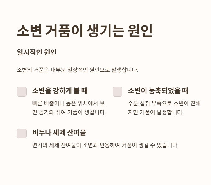- 비누나 세제 잔여물: 변기에 남아 있던 세제나 비누 성분이 소변과 반응하여 거품이 생길 수 있습니다.