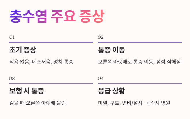 - 급성 충수염은 수술이 필요한 응급 질환이므로, 의심되면 즉시 병원을 찾아야 합니다. 🚑