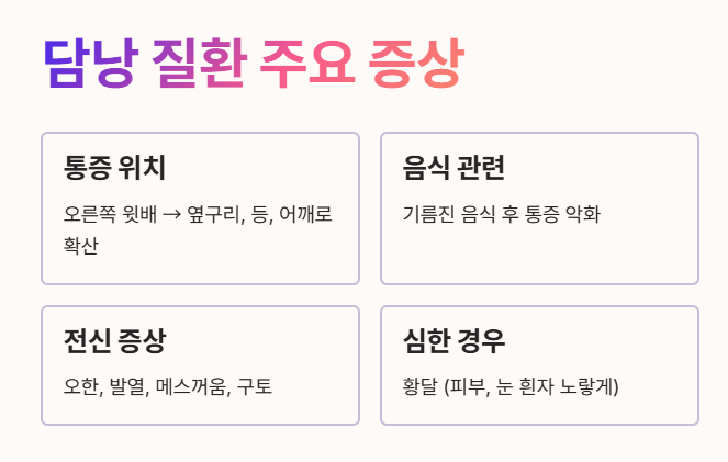 - 주로 오른쪽 윗배에 심한 통증이 나타나지만, 오른쪽 옆구리나 등, 어깨 쪽으로 통증이 퍼져나가기도 해요.